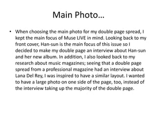 The document describes the process of creating a double page spread for a music magazine. The author chose to do an interview with the musician Han-sun, who is the focus of the issue. They took casual photos of Han-sun with a ukelele during the interview to use as the main photo. In Photoshop, the author edited the photo by cutting out the background and adding a red outline. In Quark, they laid out the interview on the pages, placing the photo on one side with a quote, and adding smaller photos and consistent fonts to match the magazine's style.
