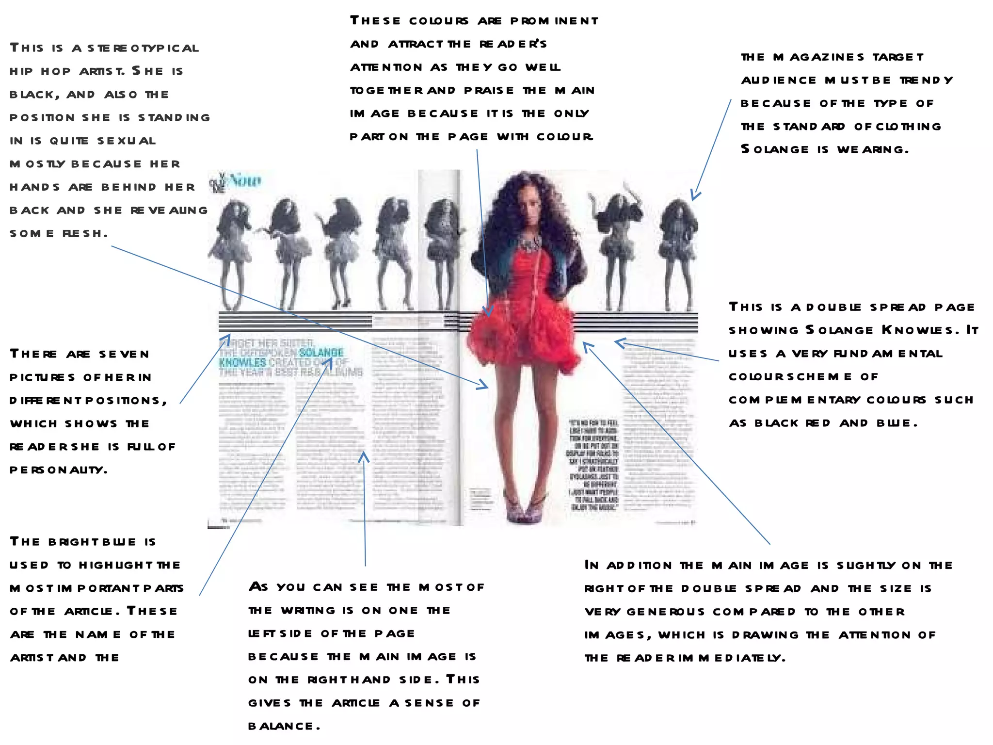 This double page magazine spread features Solange Knowles. It uses a color scheme of black, red, and blue that complement each other and draw attention to the main central image of Solange. There are seven pictures of her in different poses, showing her personality. The layout follows a conventional "C" type format with the heading on the top right and image on the middle left and text on the bottom right, making it visually clear and easy to read. The plain white background and bold colors and typography are used to attract readers.