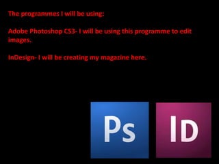 1) The document describes the process of creating a double page spread for a magazine in Adobe InDesign and Photoshop. Key elements like headings, text, and images are arranged across two pages and styled with colors and effects consistent with the magazine's brand.