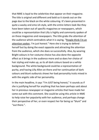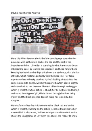 Lilly Allen poses confidently on a double-page magazine spread. She leans forward with her hands on her hips, looking directly at the camera with a cheeky expression. Her messy hair and dark eyeliner give her a rough look that matches the article's theme of her being blunt and honest. The spread's bold black and white color scheme and collage text style grab attention, contrasting with Allen's quote that she isn't seeking attention. The white background contrasts her dark outfit and makeup, representing her mixed personality traits. Allen may be using the article to justify past comments and change her audience's perspective of her blunt honesty.