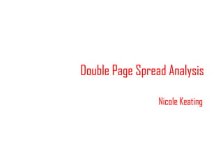 The double page spread is about artist Lady Gaga. It uses large images and text to draw attention to key information. The main image shows Lady Gaga in a provocative pose that highlights her confidence and uniqueness. Additional details like small text and dark colors provide context about her artistic style and personality. The layout is unconventional compared to typical spreads, using visual elements to entice readers to learn more about Lady Gaga through the article.