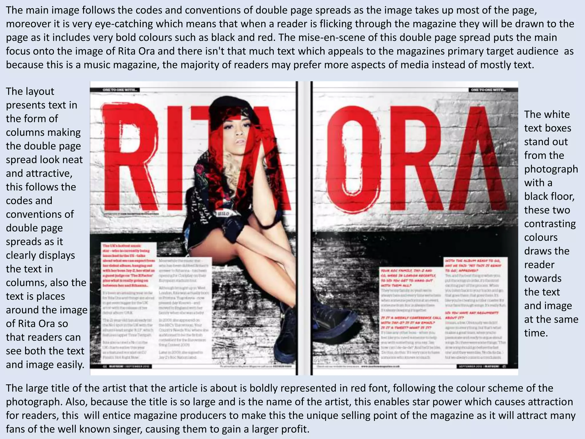 This document analyzes the codes and conventions used in double page magazine spreads. It examines spreads featuring Rita Ora and Florence Welch. Some techniques discussed include using large eye-catching images, bold colors, columnar text layouts, introductory paragraphs before the full article, and featuring famous artists to draw readers in with their star power. The goal is to attract readers while flicking through the magazine and entice them to read the full article.