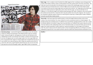 This document summarizes and analyzes the layout, design, and style of two magazine double spreads featuring Lana Del Rey and Lily Allen.