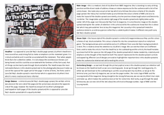 This document summarizes and compares the layout, design and stylistic elements of two magazine double page spreads - one featuring Lana Del Rey from Q Magazine and the other featuring Lily Allen from NME Magazine. Both spreads use a prominent image to draw attention to the featured artist. While Lana Del Rey's image takes up the full page with a dark and mysterious tone, Lily Allen's more casual mid-shot image overlaps pages to emphasize her down-to-earth persona. The magazines also differ in design balance, with Lana Del Rey's being more formally divided while Lily Allen's overlaps elements across the spread.