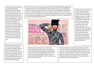 This double-page magazine spread focuses on Nicki Minaj. The dominant color is pink, matching Nicki Minaj's known girly public persona. Her name and a photo of her wearing pink lipstick are featured. The simple color scheme of pink, black, and white matches elements of Nicki Minaj's identity and style. Sections of text have titles to allow readers to choose which parts to read. Imagery, fonts, and pull quotes are designed to draw the reader in and encourage reading the full article.