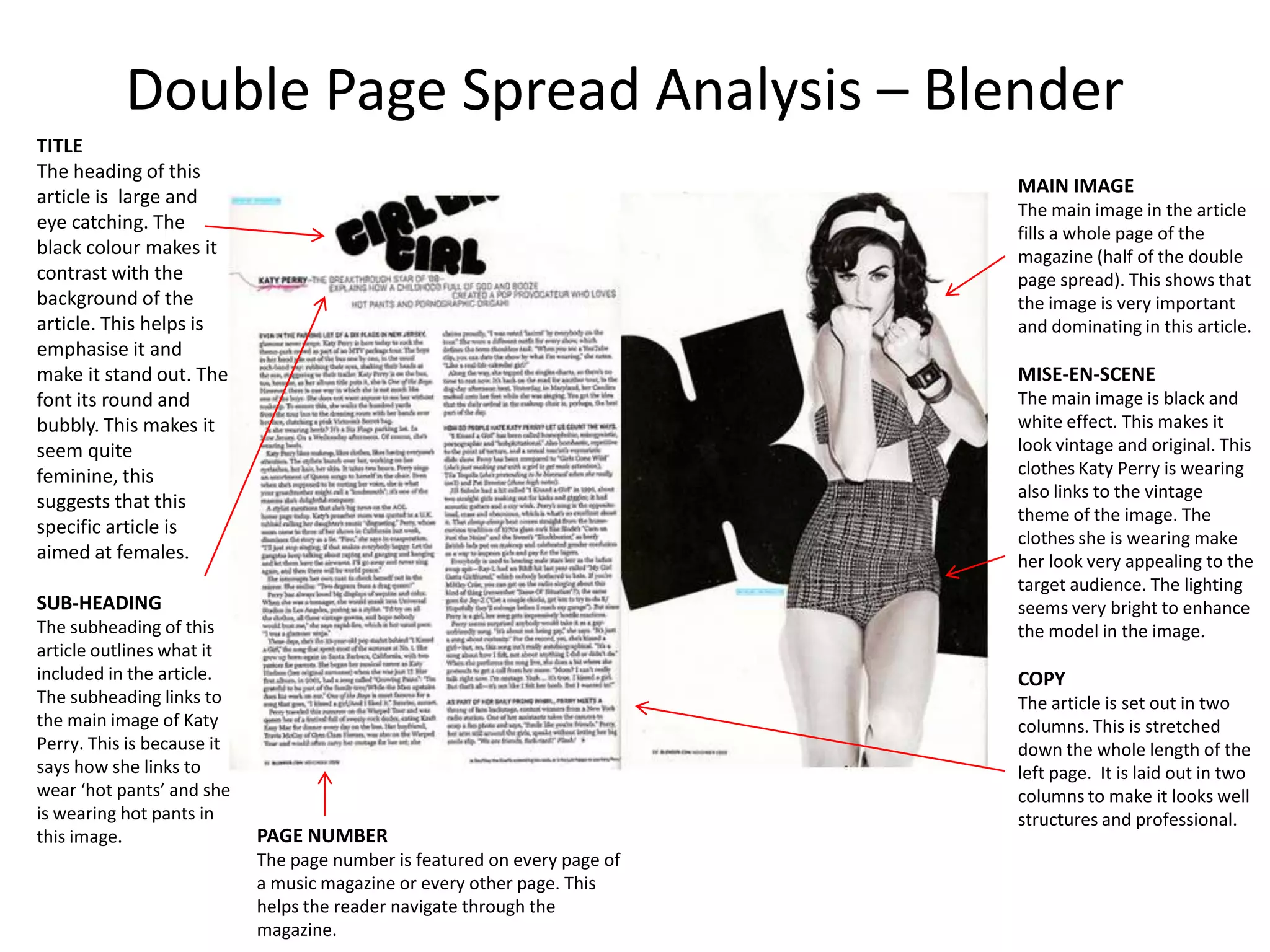 1) The main image takes up the entire double page spread and features Katy Perry wearing vintage-inspired clothing to match the black and white aesthetic.