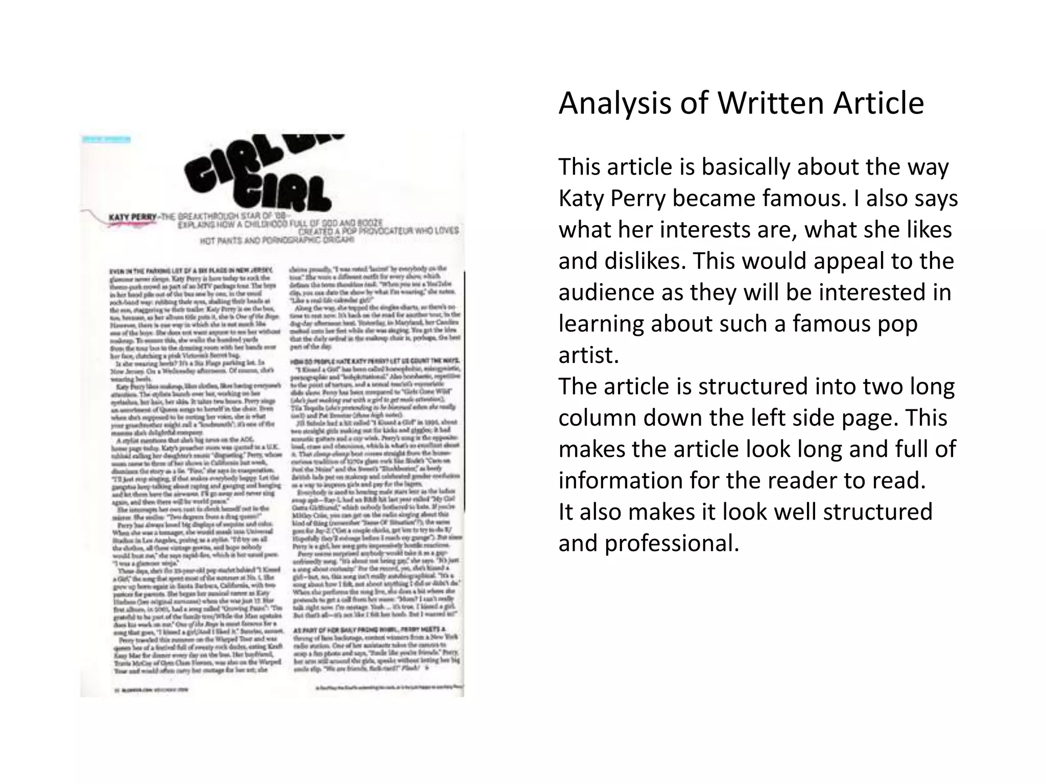 2) The article uses a two-column layout to provide a structured and informative breakdown of Katy Perry's rise to fame and her interests.
