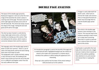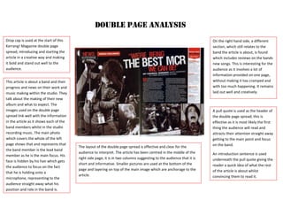 The document analyzes the layout and design of a double page magazine spread about a band. It discusses how the large central image of the band wraps around the page and the text is arranged around it. Other design elements discussed include use of pull quotes, drop caps, column structure, font styles, and additional photos and reviews to engage the reader. The overall layout is analyzed as being effective at clearly presenting information about the band and their new music in a way that would interest readers.