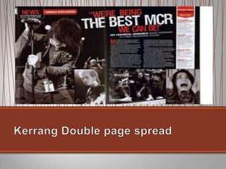 The document compares and contrasts the layout and design elements of articles about the band My Chemical Romance from two different music magazines: NME and Kerrang. It analyzes the fonts, headlines, images, captions, pull quotes, columns and other stylistic choices used in both articles and how they are intended to attract readers' attention and guide them through the content. The key differences noted are that Kerrang uses a more complex layout with multiple small black and white images compared to NME's single large color photo, and Kerrang's structure leads the eyes around the page more while NME's is more linear.