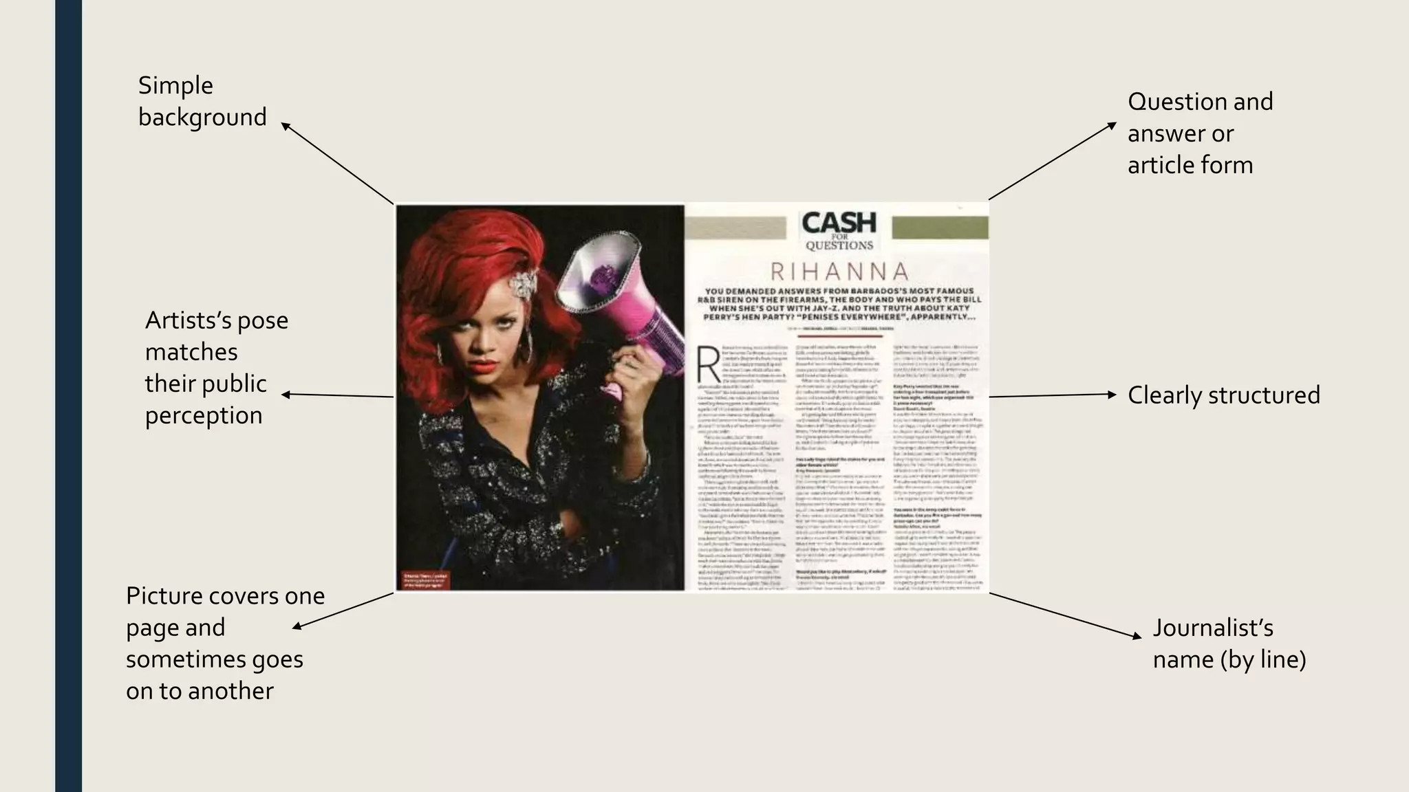 This document outlines common codes and conventions used in double page spreads for magazines, including having the picture cover one page and sometimes extend to another, using simple backgrounds, and structuring content in a question and answer or article format with the journalist's name. Visual elements are carefully considered, such as an artist's pose matching their public perception, lighting matching the article topic, and color schemes coordinating with the magazine's style. Formatting conventions include using drop capitals, 3-4 columns, and very few fonts.
