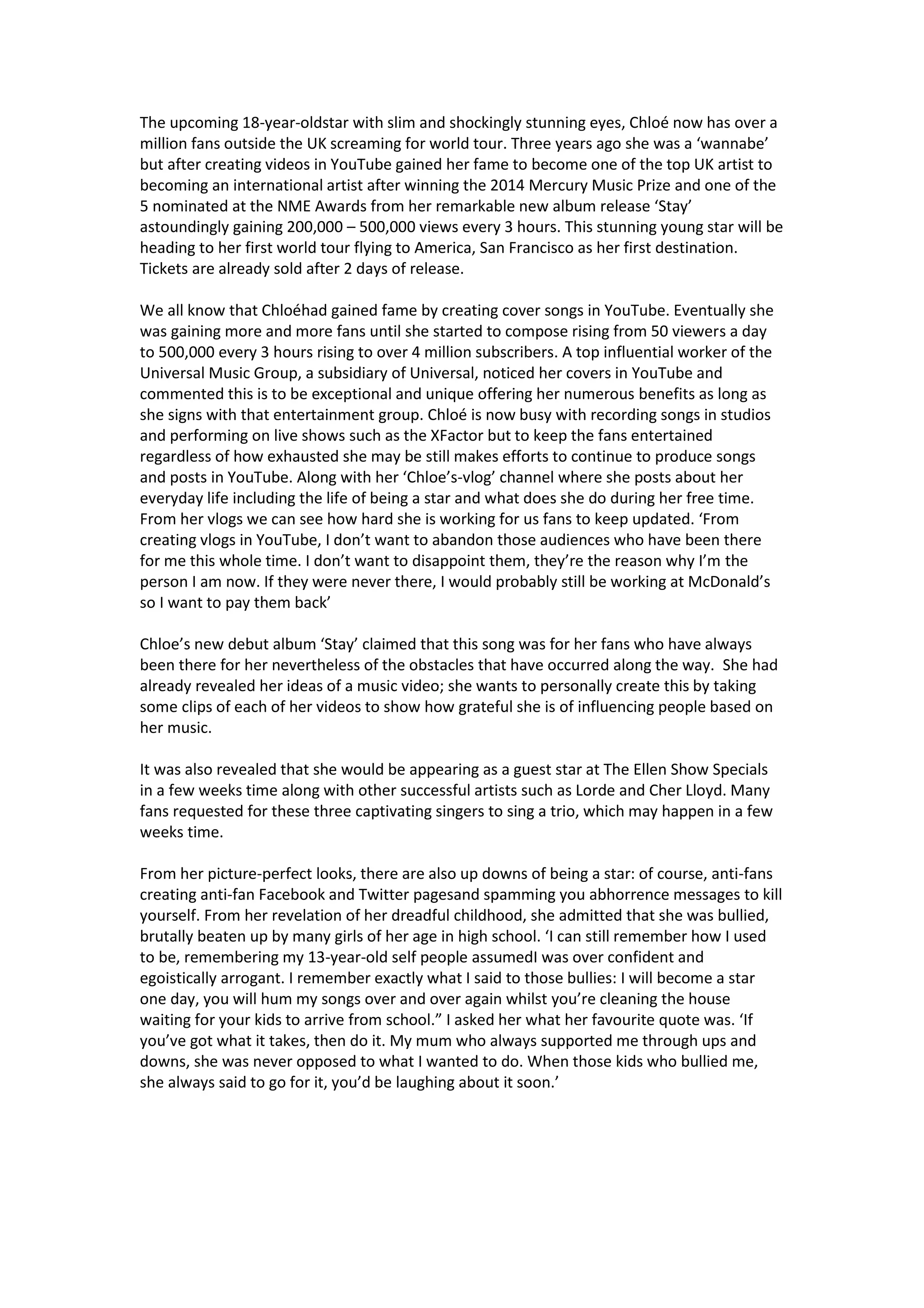Chloé is an 18-year old singer from the UK who has gained over a million fans through her YouTube covers and music videos. She won awards like the Mercury Music Prize and has a new album called 'Stay' that gets hundreds of thousands of views every few hours. Chloé is now going on her first world tour starting in San Francisco. Though she used to be bullied in school, Chloé worked hard posting covers and videos on YouTube until she was signed by Universal Music Group and became a successful international artist.