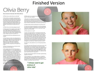 The document summarizes Matthew Rogero's process for creating a double page spread magazine article. It discusses that he had limited time to capture images but managed to get good shots of Olivia with expressive facial expressions. The writing process took more time than shooting. Editing the selected images required experimenting with brightness and color to enhance them. If doing the project again, Rogero would focus on better time management to avoid rushing due to other concurrent tasks. Overall, the process prepared him for similar future projects.