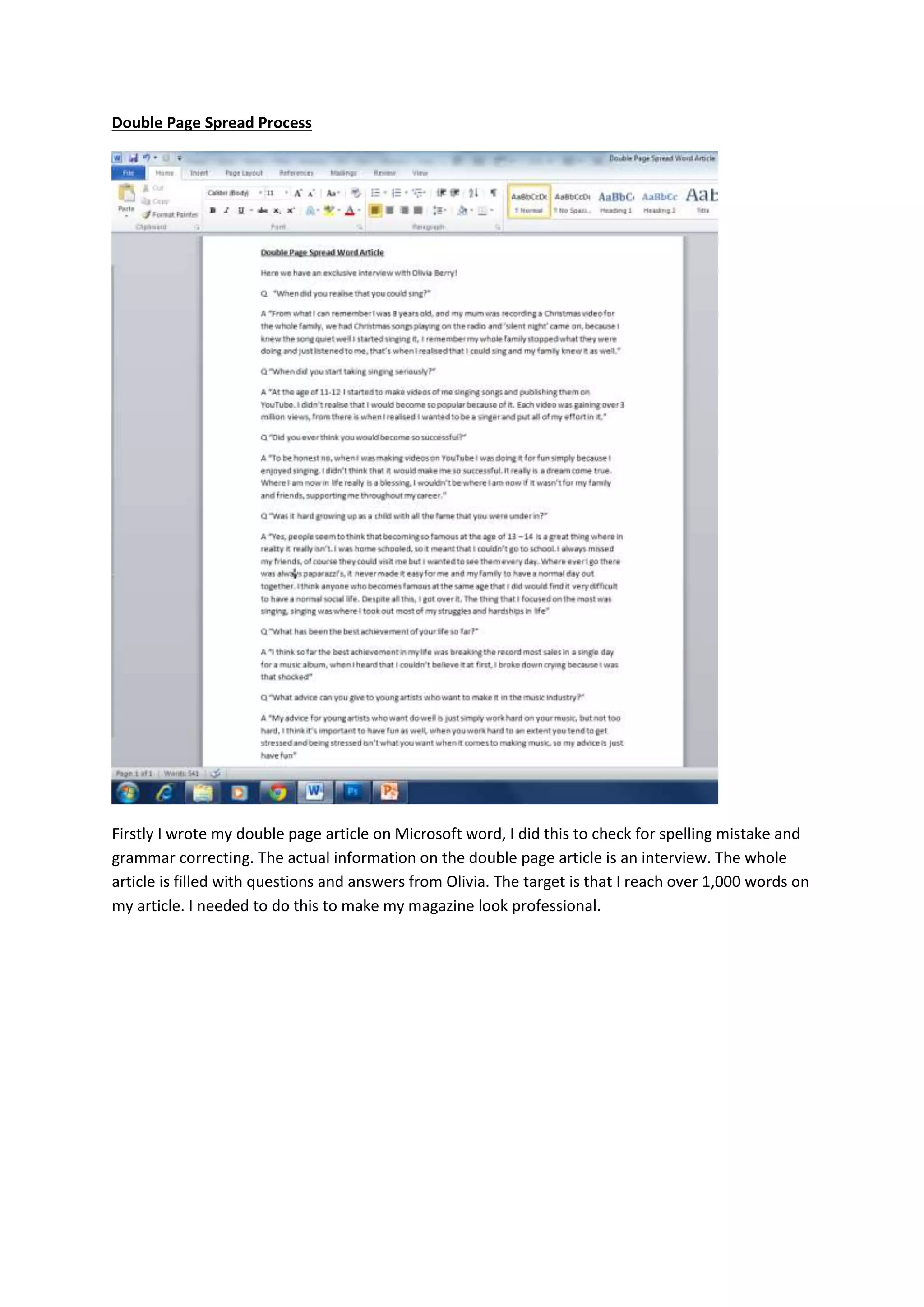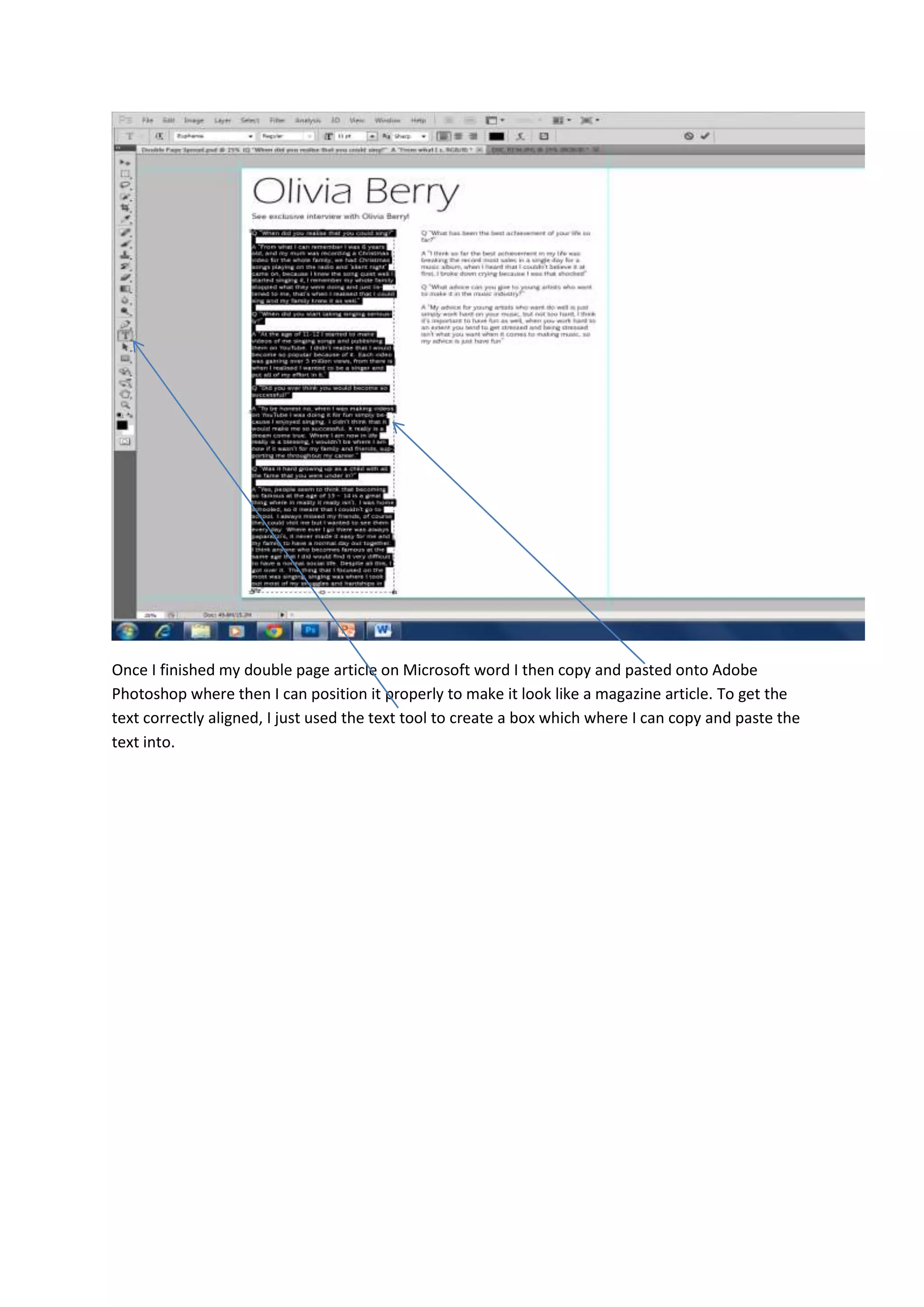 1. The document describes the process of creating a double page magazine spread in Adobe Photoshop, including interviewing someone named Olivia to write a 1,000+ word article.