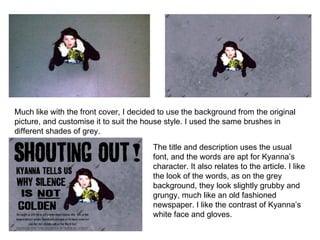 The document summarizes design choices made for a double page spread in a publication. It describes using a background image from the original photo and customizing it to fit the publication style using different shades of grey brushes. The title and description use the standard font and words that relate to the character and article. The text on the grey background has a slightly dirty, old newspaper appearance which contrasts well with the white face and gloves of the character photo featured. Pull quotes from an interview are included in three columns of spaced text with questions in bold formatting.