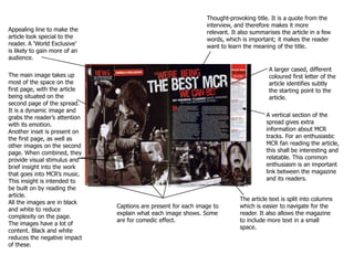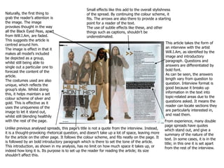 This document describes the layout and design elements of magazine spreads featuring interviews. It notes how images, titles, introductions, and column formatting are used to attract readers' attention and guide them through the content. Placement of the article on the second page with a large image on the first page is described. Captions, quotes, and variations in question and answer length in interviews are discussed as techniques to engage readers. Color schemes, fonts, and design features are analyzed in terms of setting tone and reinforcing the personality of the subject.