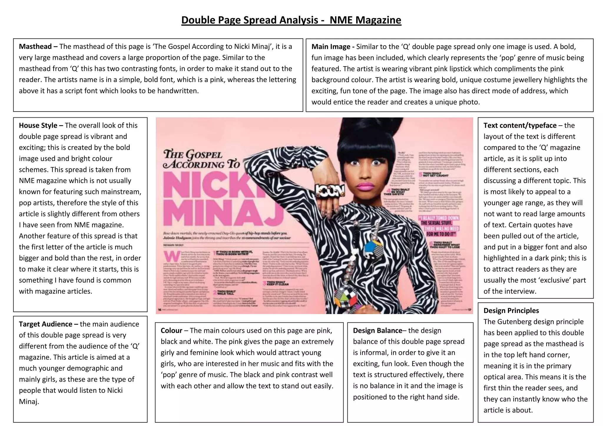 This double page spread from Q Magazine focuses on Adele's achievements over the past year and provides information about her next album. The simple and sophisticated font matches Adele's music style and older audience. Red, white, and black colors give the article a formal look. The only image is a large photo of Adele holding a cigarette, creating a sophisticated tone. The target audience is older teenagers and adults who listen to Adele's music.