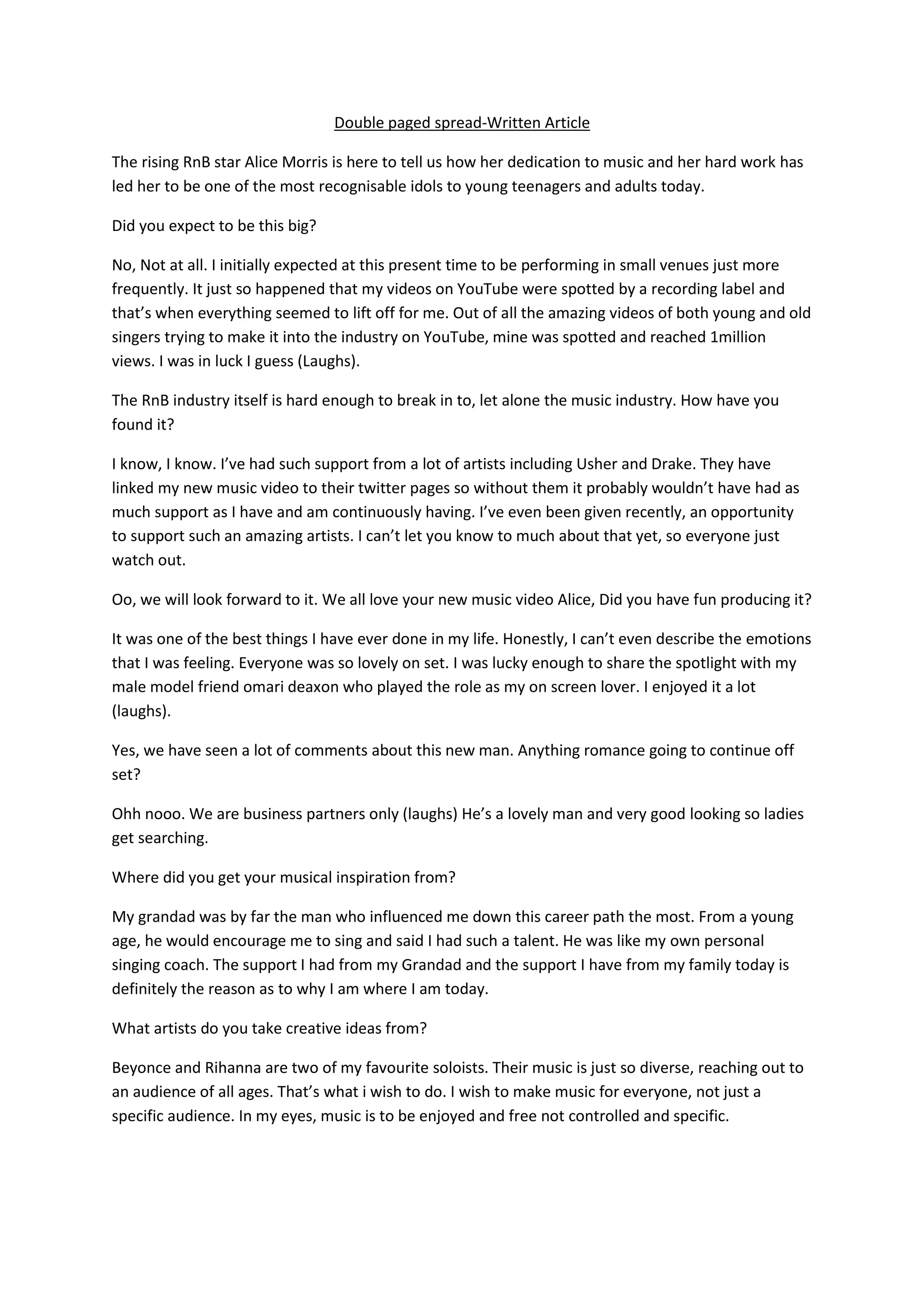 Alice Morris is a rising R&B star who gained popularity after her music videos on YouTube received over 1 million views and caught the attention of a record label. Though she did not expect to achieve such success so early in her career, she has found support from established artists like Usher and Drake who have promoted her new music video. Alice enjoys making diverse music inspired by artists like Beyoncé and Rihanna that can appeal to audiences of all ages. Her advice for aspiring singers is to never give up pursuing their dreams despite criticism, and to use platforms like the internet to get their music noticed.