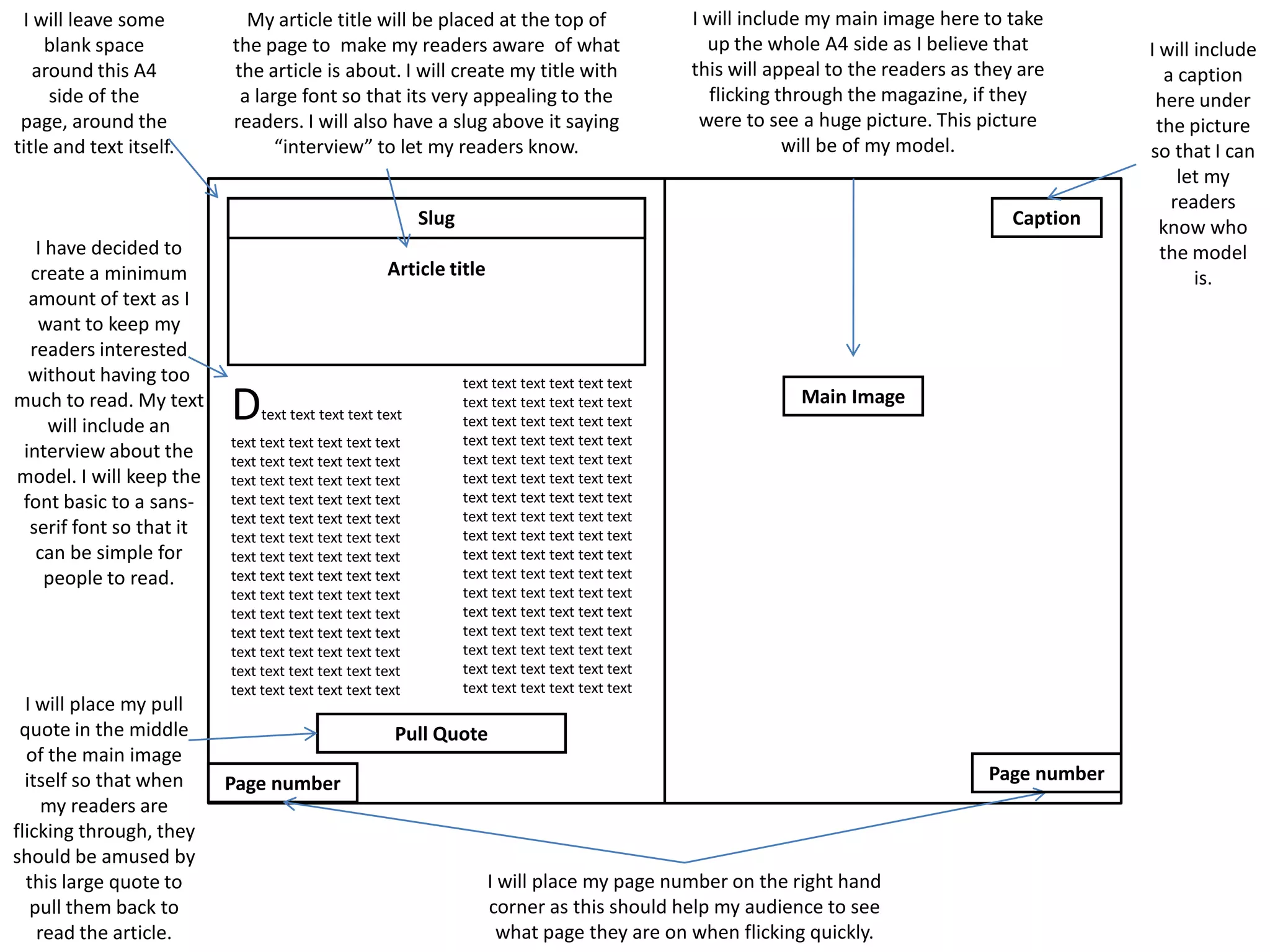 The document describes the layout for an article page in a magazine. It will include a large title at the top in a bold font along with a "slug" indicating it is an interview. The main image will take up the whole page side with a caption below identifying the model. Short snippets of text will surround these elements with a pull quote placed over the main image. Page numbers will be placed in the corners to help readers navigate while quickly looking through the magazine.