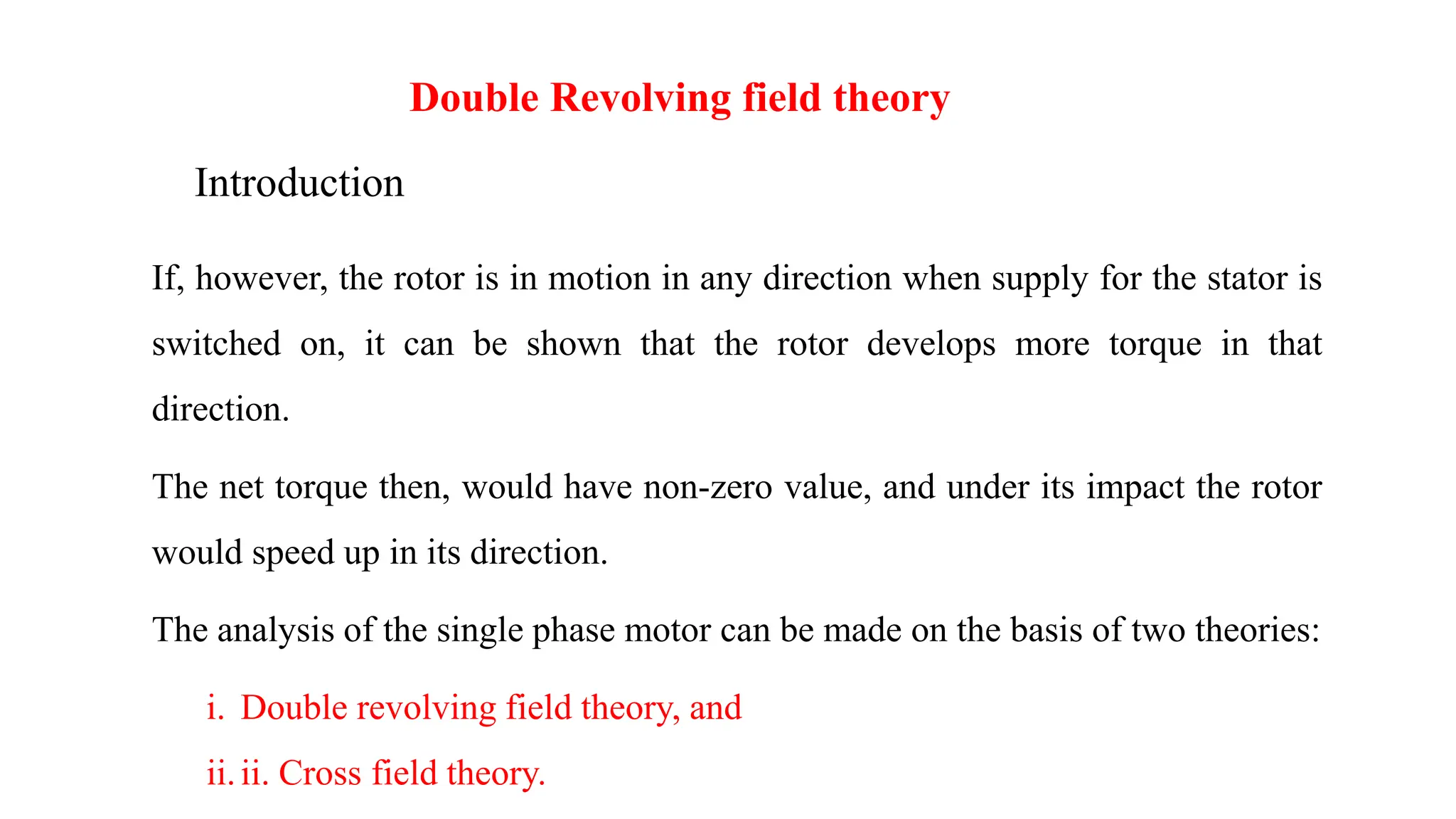 The document discusses single-phase induction motors, focusing on their constructional features and two primary theories: double revolving field theory and cross field theory. It explains how the double revolving field theory resolves a single pulsating magnetic field into two opposite rotating fields, and illustrates the behavior of these fields over a cycle to demonstrate the nature of alternating flux. Additionally, it covers split-phase starting methods and applications relevant to these motors.