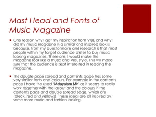 The document discusses the design choices made for a music magazine project. It was inspired by magazines like VIBE in terms of layout, fonts, and photos focusing on a single model. Photos were taken against plain backgrounds and edited to look more professional. Costumes and props were used to portray wealth as seen in other music magazines. The genre of R&B is represented through formal language, seductive photos, and fashion elements. The layout follows magazine conventions while making adaptations to make it unique.