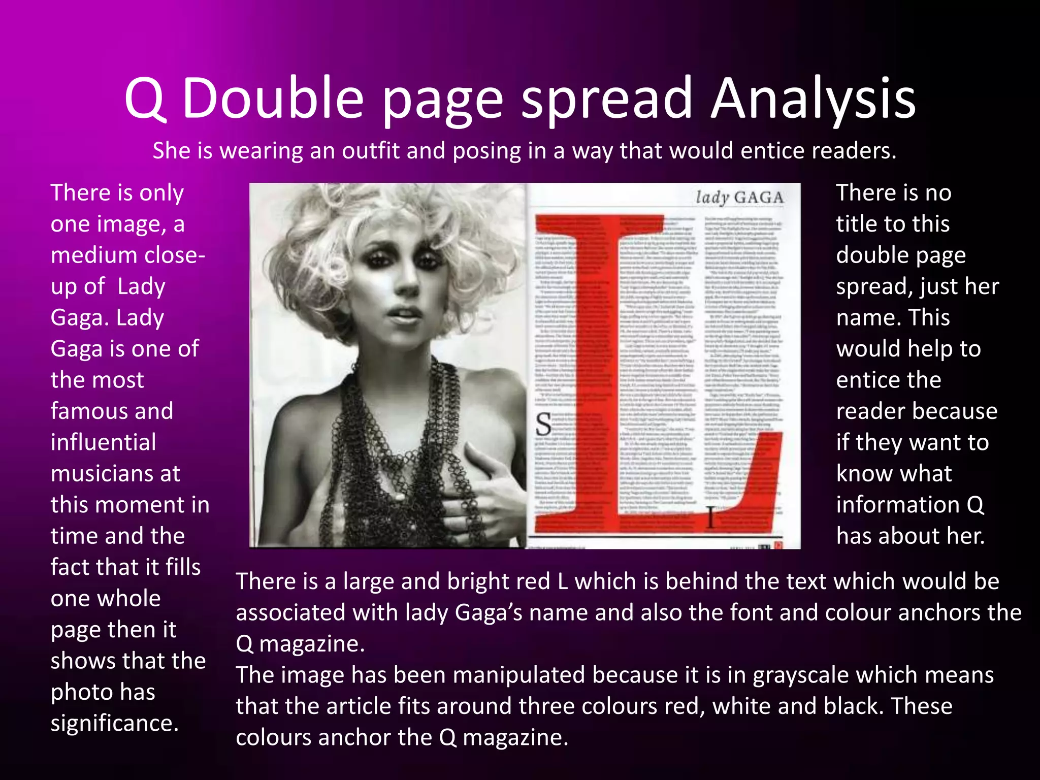1) A Lady Gaga spread from Q magazine features a close-up photo of her covering one page to signify her importance.