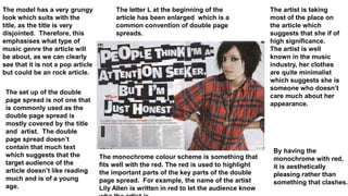 The document analyzes a double page spread featuring an article about Lady Gaga, emphasizing her significance and artistic representation through a monochrome color scheme and provocative imagery. The layout includes bold lettering and minimal text, suggesting a target audience of young readers who prefer visual over written content. The overall design choices, including the use of red to highlight key elements, indicate an appeal to femininity and a rock music genre aesthetic.