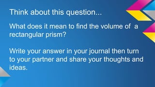 The document discusses doubling the volume of a rectangular prism. It asks students to find dimensions of a box that holds twice as many cubes as a 2 x 3 x 5 box. Students brainstorm ideas and watch a video on doubling volume. They then list different dimensions that satisfy doubling the volume, where some only double one dimension and the product of all dimensions is 60, using factors of 60.