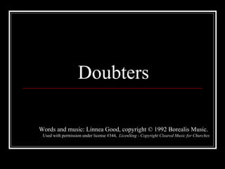 The document discusses how several biblical figures like Thomas, Nicodemus, the woman at the well, and Mary were all doubters who questioned Jesus and had to wait for their faith to grow. It suggests that believing may be easy but faith develops slowly through doubt, and that minds are ready to believe when they have waited and not come to a hasty conclusion.