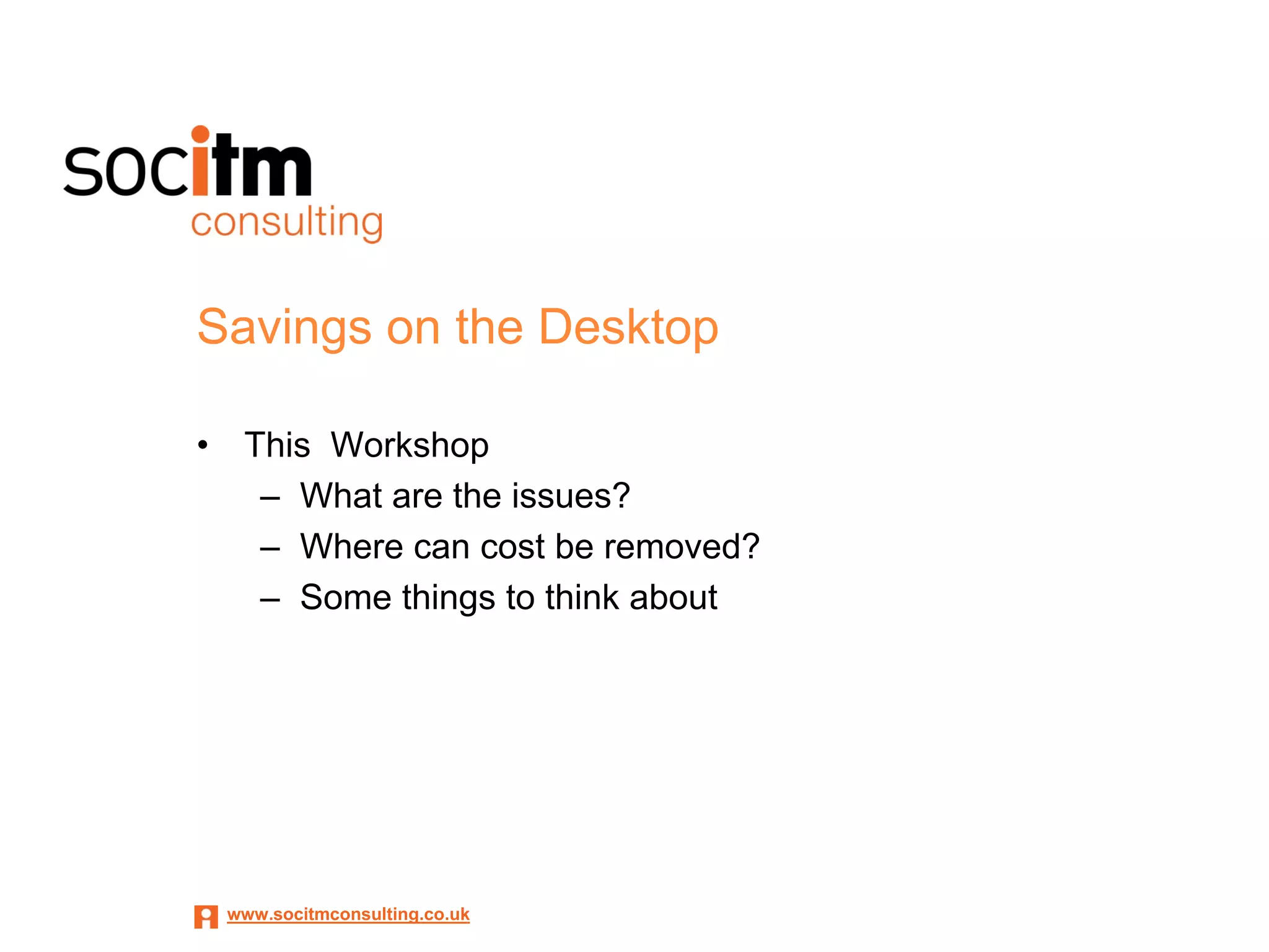 The document discusses cost-saving strategies related to desktop management, addressing issues such as device procurement, support, and network costs. It highlights constraints in managing device inventory, security, and software licensing while suggesting areas for potential savings through various approaches like thin clients and shared services. The focus is on achieving a business-case driven investment model to enhance efficiency and reduce expenses.