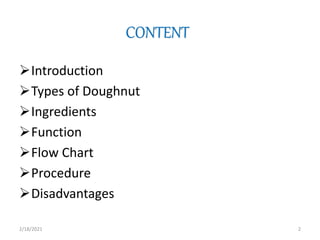 This document discusses the process of making doughnuts. It begins by introducing doughnuts and some popular brands in Pakistan. It then discusses the main types of doughnuts - those made with chemical leaveners like baking powder versus those made with yeast. The most popular varieties are also listed. The key ingredients used in doughnuts and their functions are outlined. Finally, the document provides a detailed step-by-step explanation of the doughnut making process, from acquiring ingredients to frying, glazing, and finishing. It concludes by noting some potential disadvantages of frequent doughnut consumption.