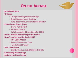 Dove's brand definition and market positioning have evolved over time. In the 1950s, Dove positioned itself as a gentle beauty soap that did not dry skin. Its marketing emphasized functional benefits. By 2007, Dove's "Real Beauty" campaign featured diverse models to appeal to women's self-esteem and redefine beauty. Dove now has an extensive product line including skin care, hair care, and deodorants. Its unconventional marketing strategies using real women have brought it recognition and loyalty among customers who feel the brand celebrates beauty in all shapes and sizes.