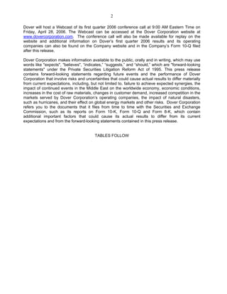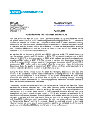 Dover Corporation reported financial results for the first quarter of 2006 with the following highlights: - Revenue increased 22% to a record $1.67 billion compared to $1.37 billion in the prior year. - Earnings from continuing operations increased 40% to $133.5 million or $0.65 per share from $95.4 million or $0.47 per share in the previous year. - Net earnings were $203.8 million or $0.99 per share, which includes discontinued operations income of $70.3 million or $0.34 per share.