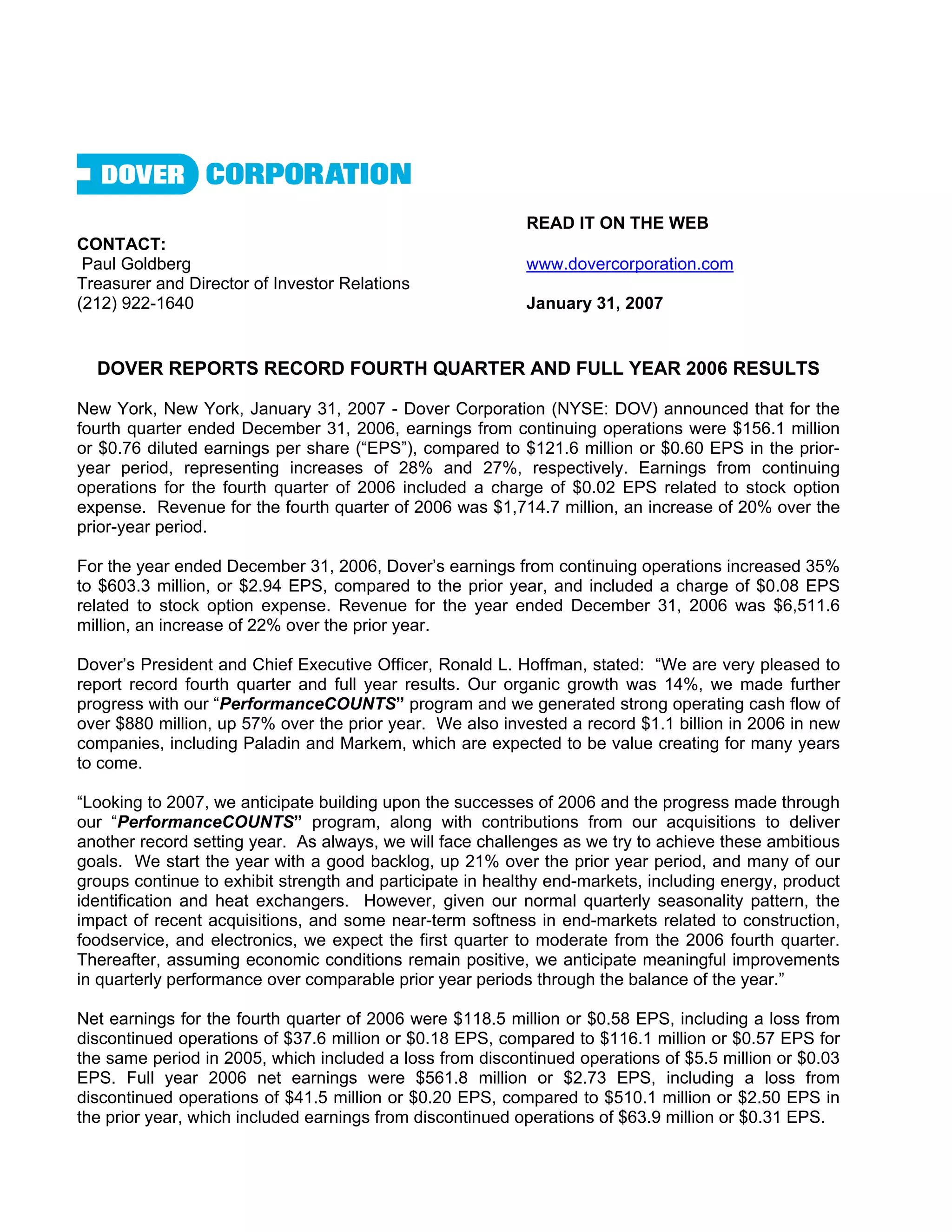 Dover Corporation reported record results for the fourth quarter and full year of 2006. Revenue for Q4 2006 increased 20% to $1.7 billion compared to the previous year. For the full year, revenue increased 22% to $6.5 billion. Earnings from continuing operations for Q4 2006 were $156.1 million, a 28% increase over the previous year. For the full year, earnings from continuing operations increased 35% to $603.3 million. The company also reported strong cash flow from operations of over $880 million for the full year, up 57% from 2005.