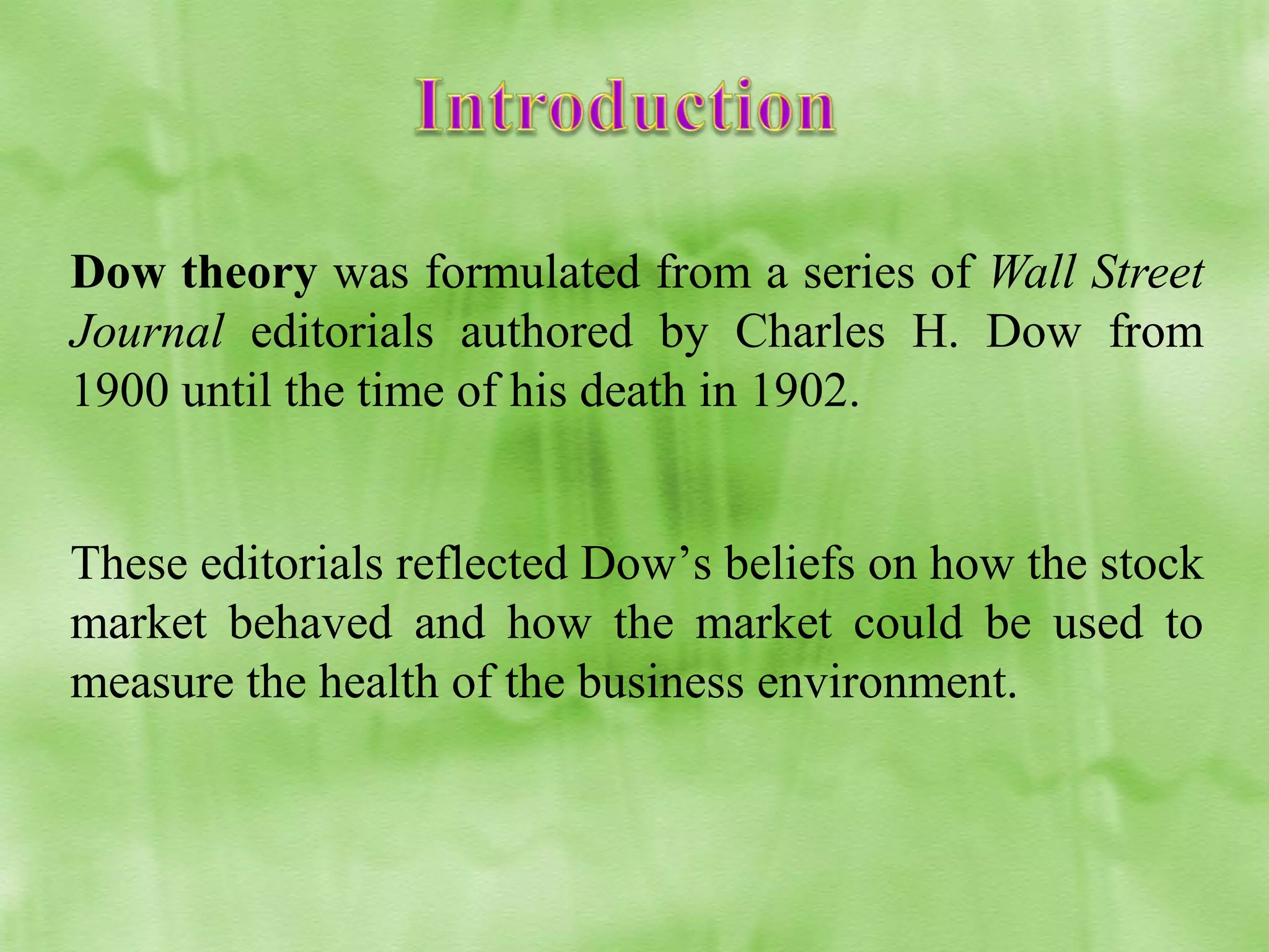 - Dow theory was formulated from a series of editorials by Charles Dow, who believed the stock market could be used to measure business conditions.