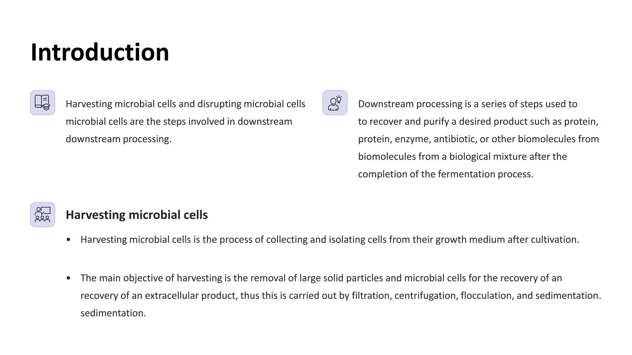• The main objective of harvesting is the removal of large solid particles and microbial cells for the recovery of an