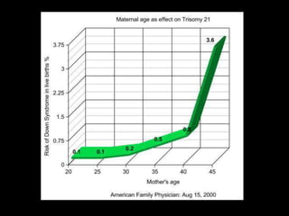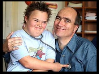 Down syndrome is the most common cause of developmental disability in newborns, occurring due to the presence of an extra chromosome. It affects 1 in 800 live births and the risk increases with the age of the mother. Symptoms include a flat nose, small mouth, slanting eyes, as well as adverse effects on hearing and sight like frequent ear infections leading to hearing loss requiring aids. While there is no prevention or cure, screening and diagnostic tests can determine the risk and manage symptoms through regular checkups and medication. Support is available through organizations providing information, love, structure and community.