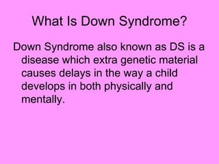 Down syndrome is a genetic condition where a person has an extra chromosome, typically chromosome 21. This extra genetic material causes delays in physical and mental development. While the cause is unknown, the risk increases with the mother's age. Down syndrome can be detected before birth through screening tests. It cannot be prevented, but women have options for continuing or terminating the pregnancy if Down syndrome is detected. People with Down syndrome have characteristic physical features including a flat facial profile and inward curving small pinky finger.
