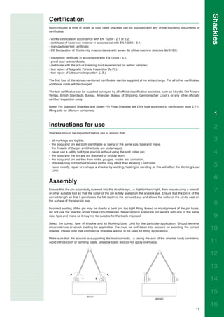 Shackles are used in lifting and static systems to connect components like wire rope, chain, and fittings. Screw pin shackles are used for non-permanent applications, while safety bolt shackles are used for permanent applications or where loads may slide and rotate the pin. Van Beest offers a wide range of shackles from 0.33 to 1500 tons working load limit in various designs, materials, finishes, and certifications. Shackles must be inspected regularly and used correctly to avoid damage or failure from misuse.