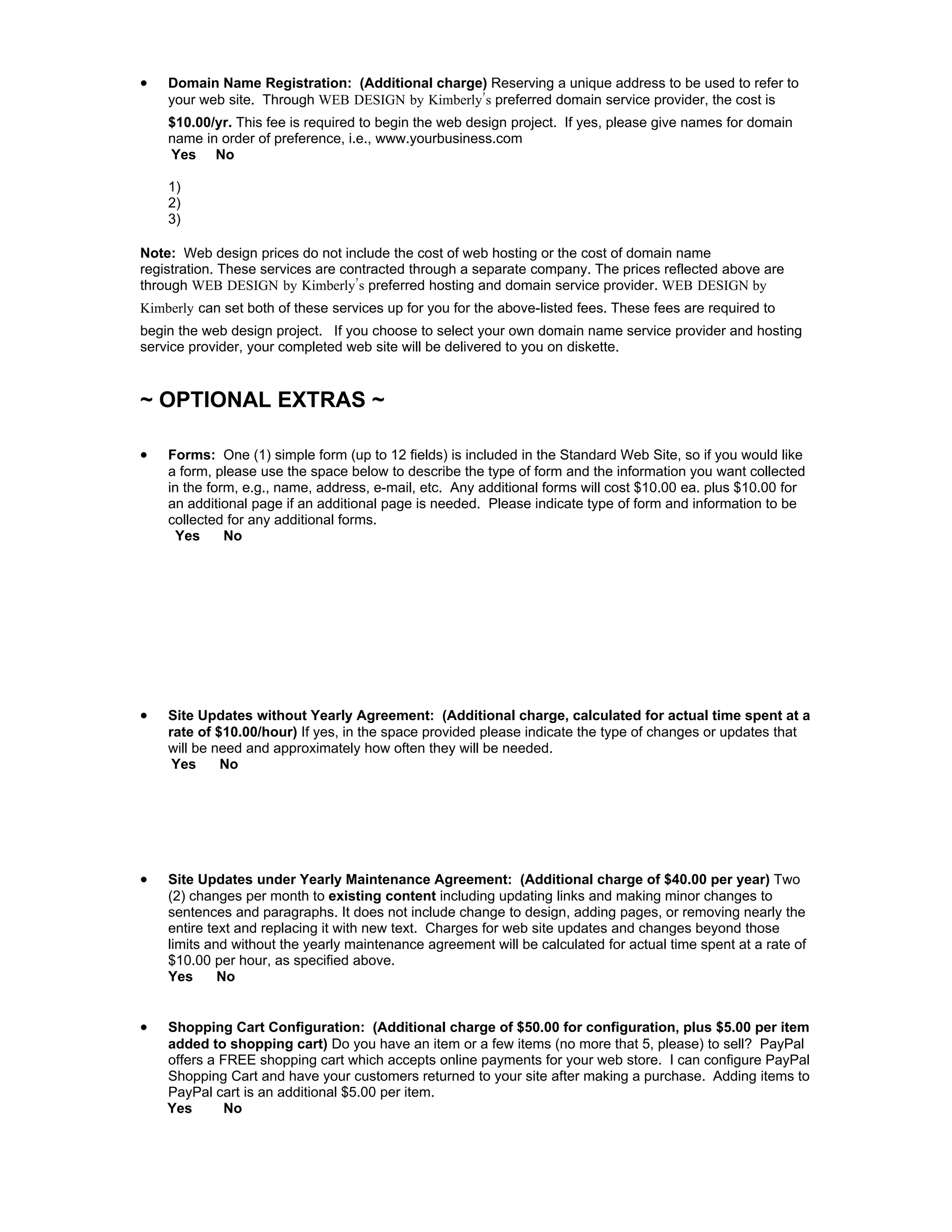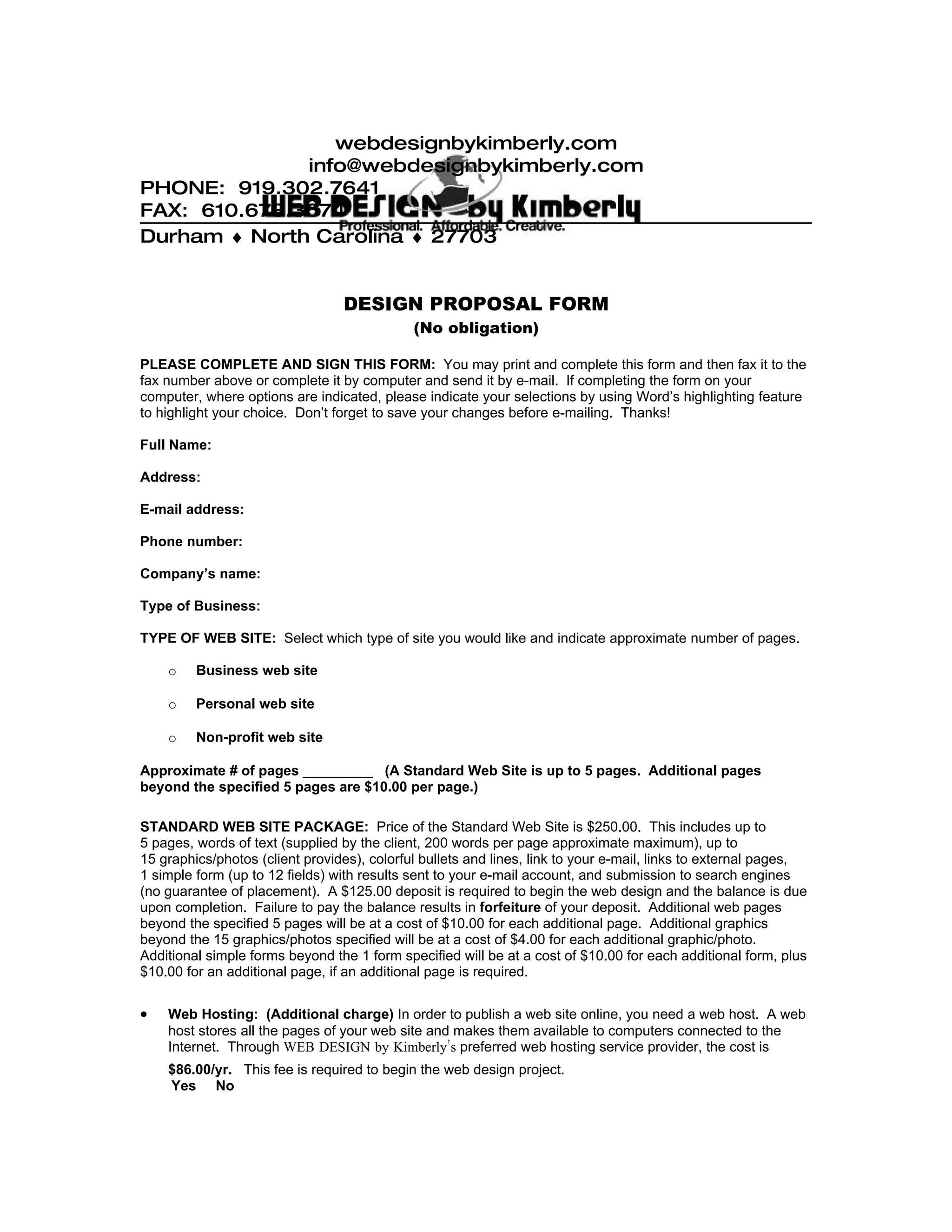 This document is a design proposal form from Web Design by Kimberly for creating a website. It outlines standard website packages starting at $250 for up to 5 pages. Additional services like hosting, domain registration, forms, updates and shopping cart configuration are available for extra fees. The form requests information from the client like business details, site specifics and graphics to begin the design process.