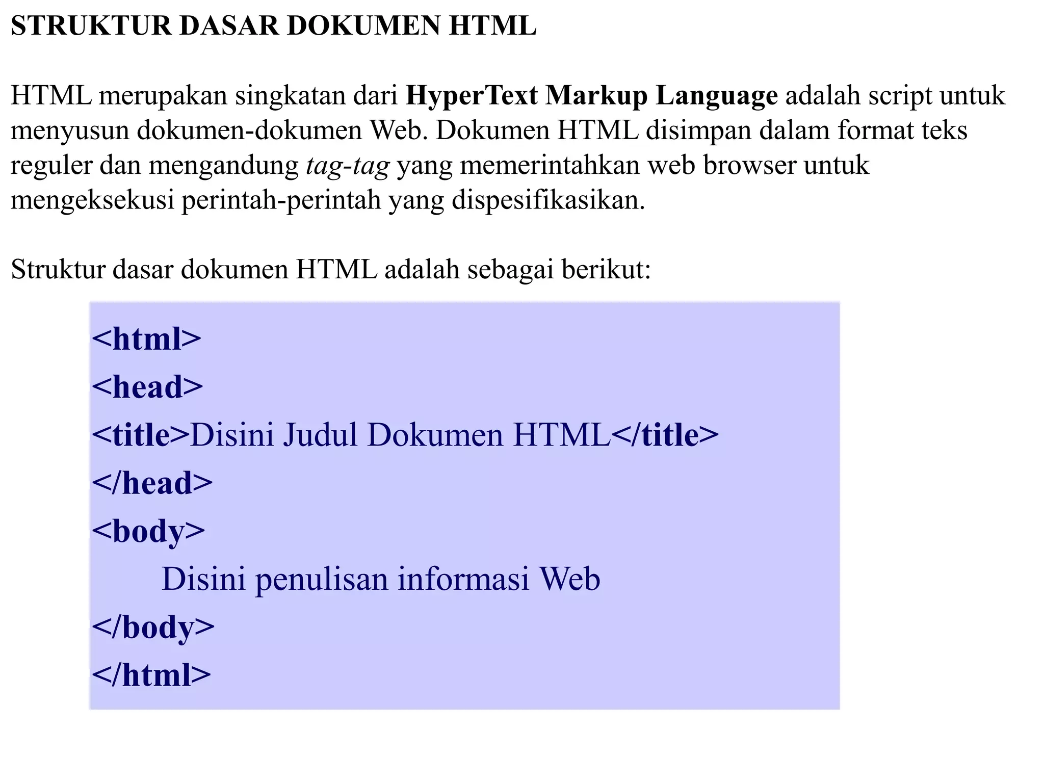 Dokumen ini membahas struktur dasar HTML, termasuk elemen, tag, dan atribut yang digunakan dalam penulisan dokumen web. Penjelasan mencakup cara penulisan tag, elemen seperti <html>, <head>, <body>, serta atribut untuk memformat teks dan warna. Juga terdapat contoh latihan untuk mengubah teks dan menampilkan elemen dengan berbagai cara.