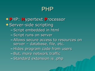 PHP is a server-side scripting language commonly used for web development. It allows code to be embedded within HTML pages and run on the server, which can then access databases, files, and other server resources. PHP code is enclosed within <?php ?> tags and the output replaces the tags in the page sent to the client. Basic PHP setup involves installing the PHP engine on a web server like Apache or IIS.