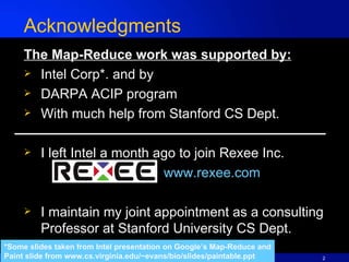 The document discusses using Map-Reduce for machine learning algorithms on multi-core processors. It describes rewriting machine learning algorithms in "summation form" to express the independent computations as Map tasks and aggregating results as Reduce tasks. This formulation allows the algorithms to be parallelized efficiently across multiple cores. Specific machine learning algorithms that have been implemented or analyzed in this Map-Reduce framework are listed.