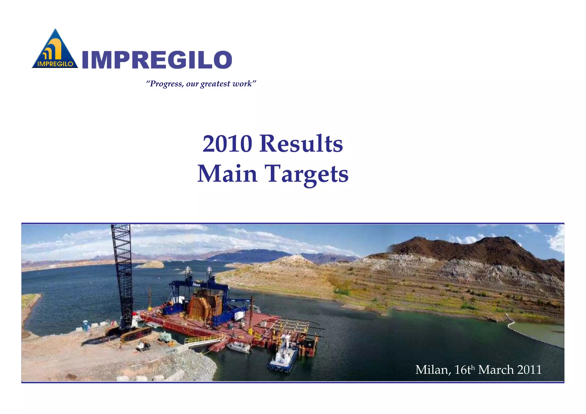 The document summarizes Impregilo's 2010 financial results and future targets. Key highlights include revenues of €2.06 billion, EBITDA of €282 million, and a net result of €128 million. The order backlog grew to €23.12 billion. Targets for 2011 include maintaining a stable debt to equity ratio and achieving an ROS of around 8% for the group. Long-term targets to 2015 include operating in 35 countries, with Italy accounting for around 35% of revenues, and expanding concessions backlog to €16 billion.