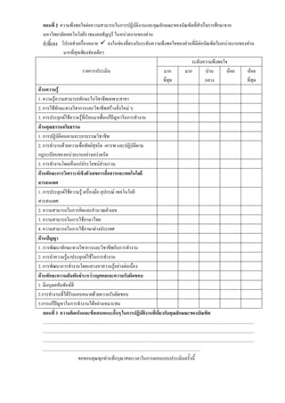 มหาวิทยาลัยเทคโนโลยีราชมงคลธัญบุรี ในหนวยงานของทาน คําชี้แจง โปรดทําเครื่องหมาย ลงในชองที่ตรงกับระดับความพึงพอใจของทานที่มีตอบัณฑิตในหนวยงานของทาน มากที่สุดเพียงชองเดียว ระดับความพึงพอใจ รายการประเมิน มาก มาก ปาน นอย นอย ที่สุด กลาง ที่สุด ดานความรู 1. ความรูความสามารถทักษะในวิชาชีพเฉพาะสาขา 2. การใชทักษะทางวิชาการและวิชาชีพสรางสิ่งใหม ๆ 3. การประยุกตใชความรูที่เรียนมาเพื่อแกปญหาในการทํางาน ดานคุณธรรมจริยธรรม 1. การปฏิบัติตนตามจรรยาบรรณวิชาชีพ 2. การทํางานดวยความซื่อสัตยสุจริต เคารพ และปฏิบัติตาม กฎระเบียบของหนวยงานอยางเครงครัด 3. การทํางานโดยเห็นแกประโยชนสวนรวม ดานทักษะการวิเคราะหเชิงตัวเลขการสื่อสารและเทคโนโลยี สารสนเทศ 1. การประยุกตใชความรู เครื่องมือ อุปกรณ เทคโนโลยี สารสนเทศ 2. ความสามารถในการคิดและคํานวณตัวเลข 3. ความสามารถในการใชภาษาไทย 4. ความสามารถในการใชภาษาตางประเทศ ดานปญญา 1. การพัฒนาทักษะทางวิชาการและวิชาชีพกับการทํางาน 2. การนําความรูมาประยุกตใชในการทํางาน 3. การพัฒนาการทํางานโดยแสวงหาความรูอยางตอเนื่อง ดานทักษะความสัมพันธระหวางบุคคลและความรับผิดชอบ 1. มีมนุษยสัมพันธดี 2.การทํางานที่ไดรับมอบหมายดวยความรับผิดชอบ 3.การแกปญหาในการทํางานไดอยางเหมาะสม ตอนที่ 3 ความคิดเห็นและขอเสนอแนะอื่นๆ ในการปฏิบัติงานที่เกี่ยวกับคุณลักษณะของบัณฑิต ............................................................................................................................................................................................... ............................................................................................................................................................................................... ............................................................................................................................................................................................... .............................................................................................................................................. ขอขอบคุณทุกทานที่กรุณาสละเวลาในการตอบแบบประเมินครั้งนี้