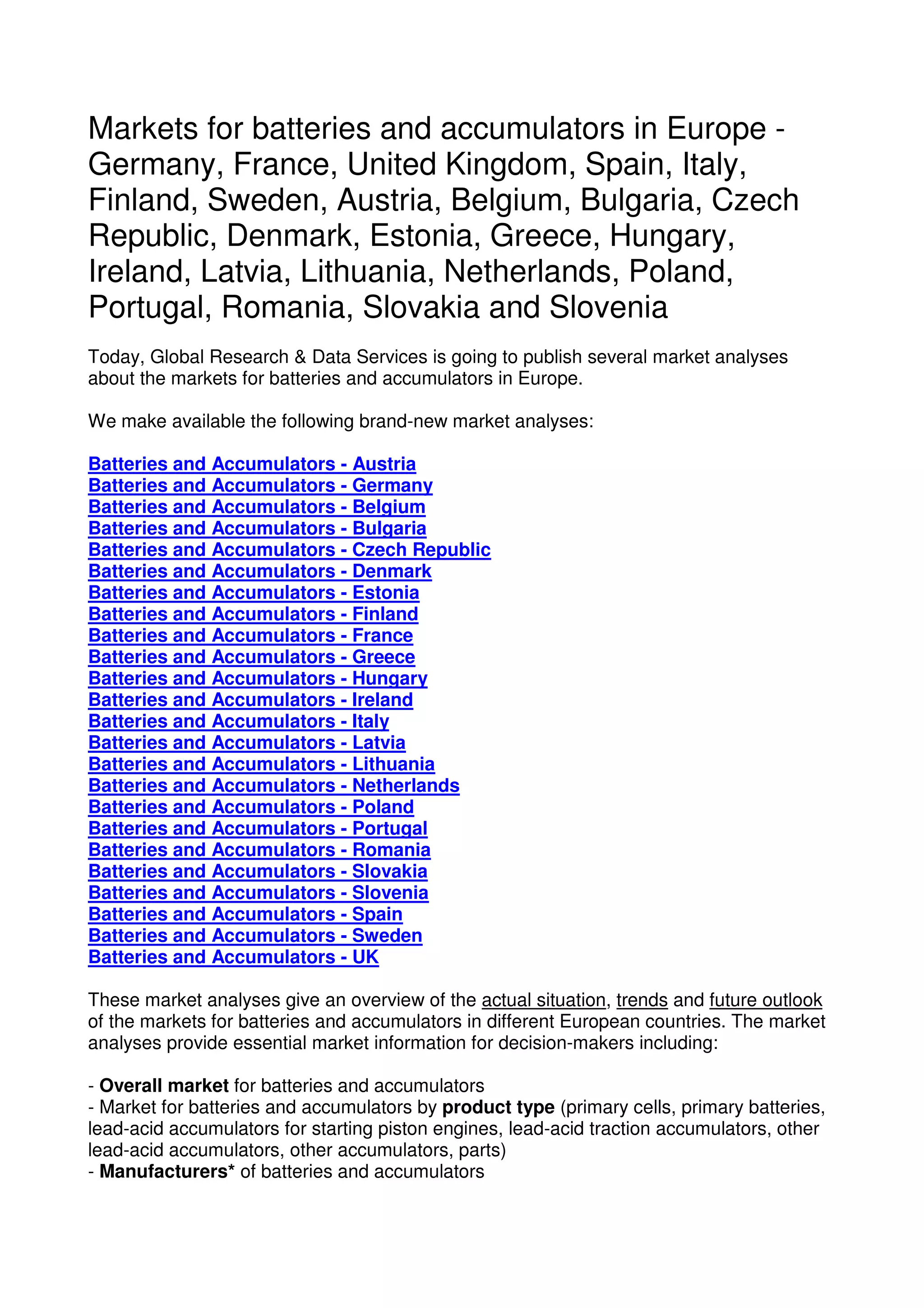 Global Research & Data Services is publishing market analyses of batteries and accumulators in 24 European countries. They are making available new analyses that provide an overview of the market situation, trends and outlook in each country's market for batteries and accumulators. The analyses include information on manufacturers and distributors in various countries, as well as forecasts for the market until 2015. The analyses can be purchased for 490 EUR each and provide essential market data for decision makers.