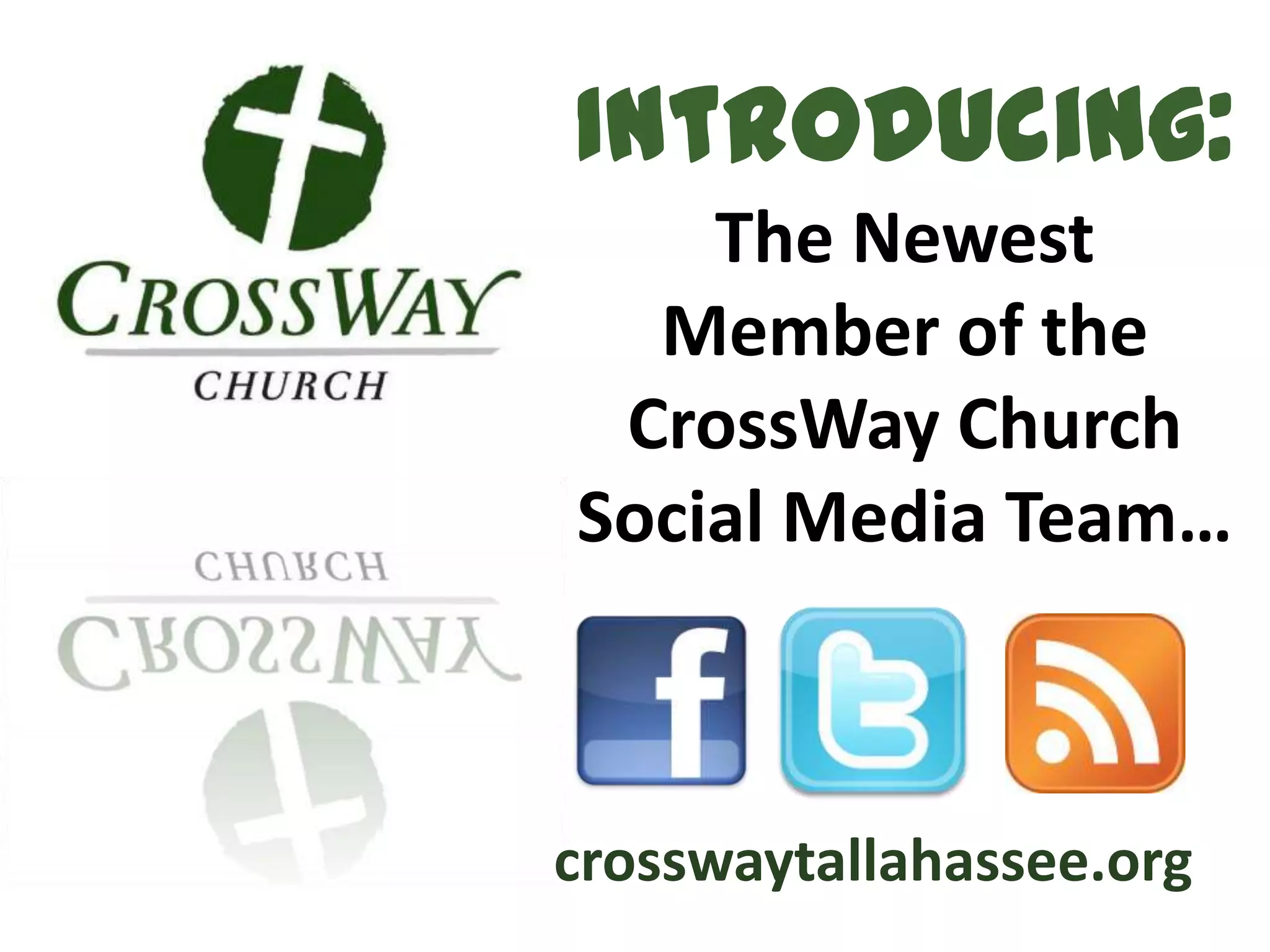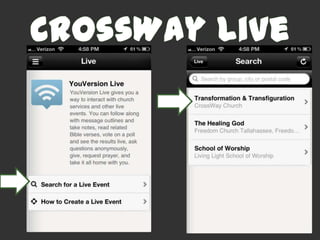 The document introduces Adam as the newest member of the CrossWay Church social media team. It provides information about CrossWay Live, a week-long interactive Bible study on the church sermon hosted on the YouVersion Bible App. Participants can listen to sermons, engage with scripture passages, notes, polls and submit prayer requests all through the Bible app or online.