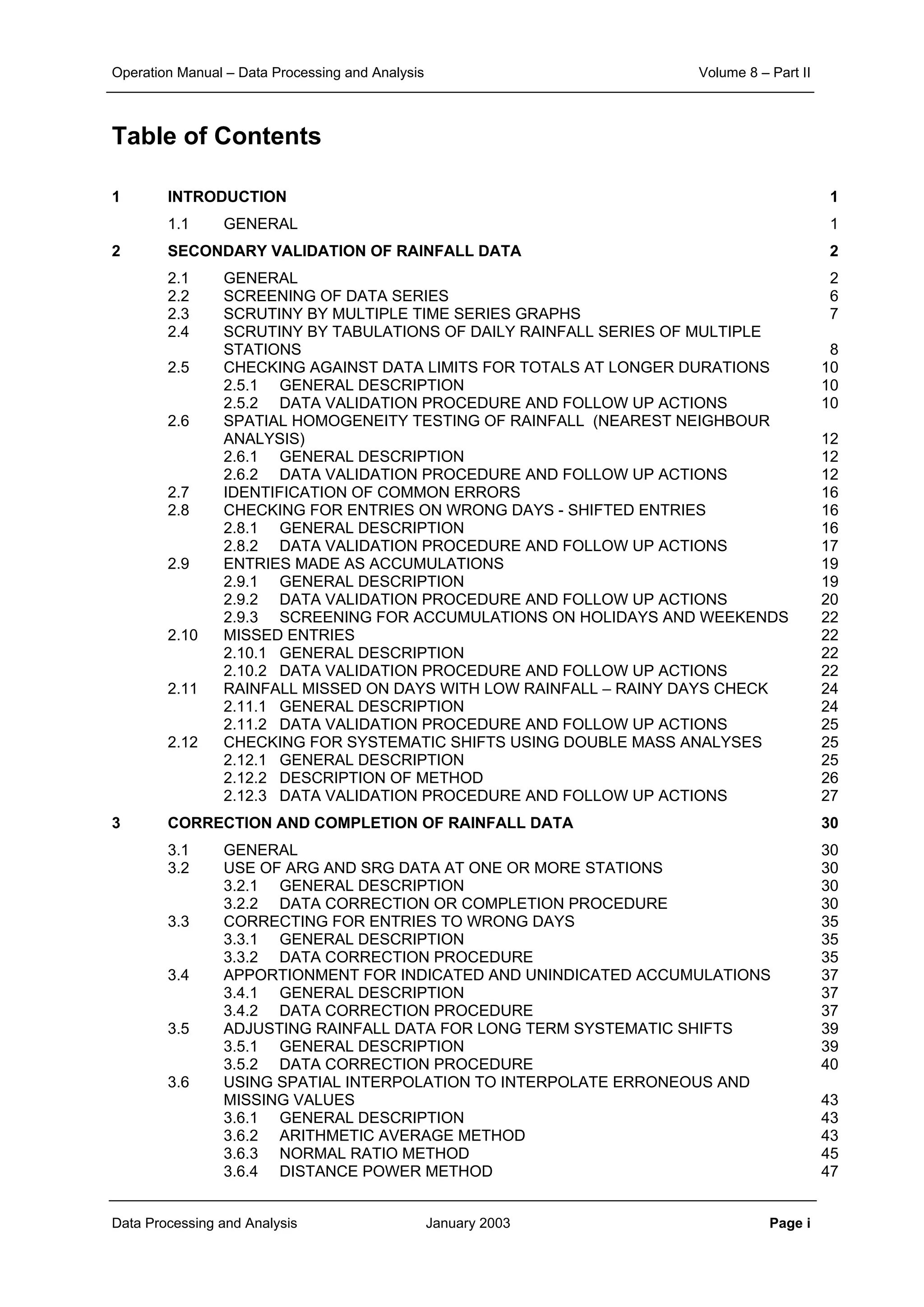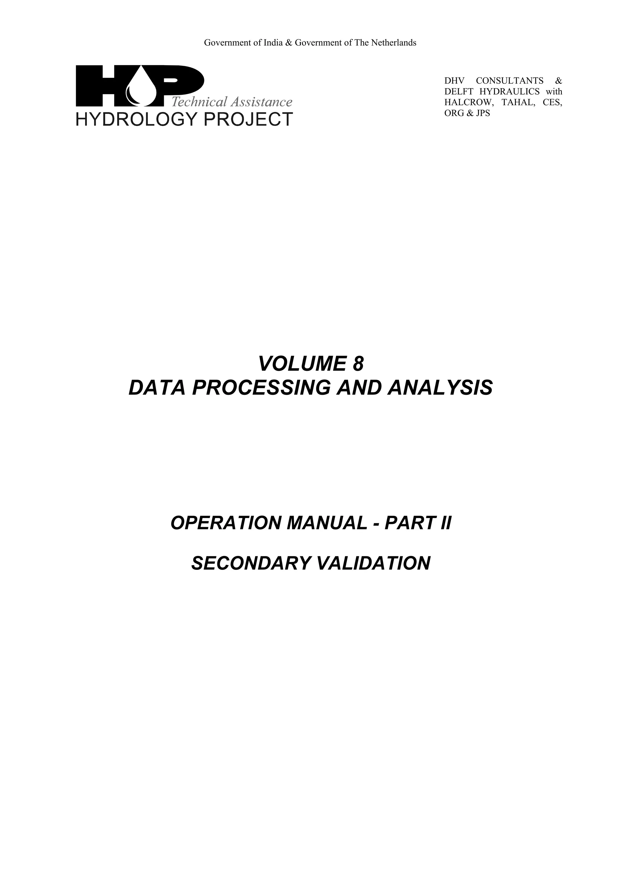 This document provides guidance on secondary validation procedures for hydro-meteorological and surface water quantity and quality data as part of a hydrological information system for 9 states in India. It describes various validation checks that can be performed on rainfall, climatic, water level, discharge, and sediment data including time series analysis, comparison against data limits, double mass curves, and spatial analysis techniques. The document also outlines procedures for correcting and completing data using neighboring station information, interpolation, and rating curves. The overall goal is to ensure standardized and high quality data processing.