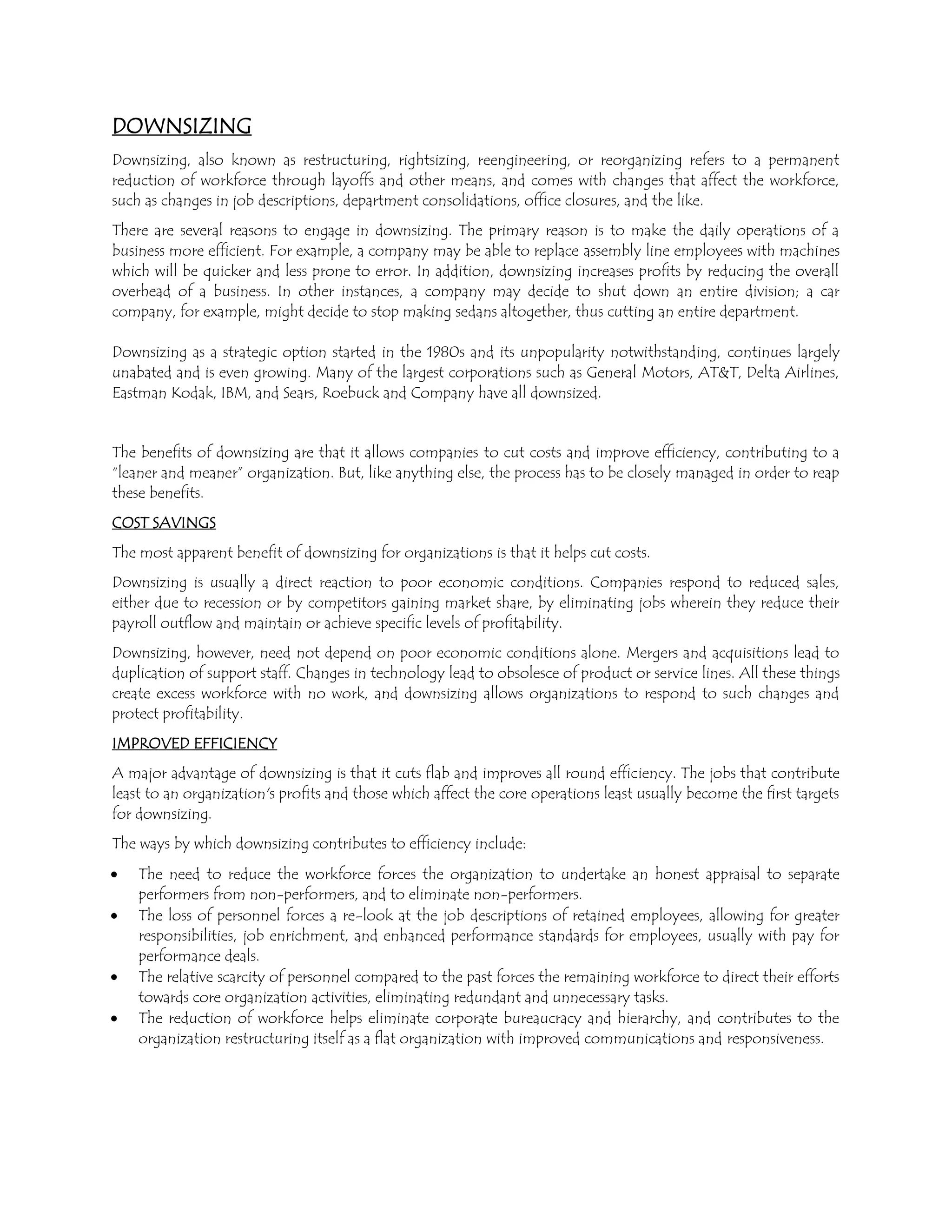 Downsizing refers to permanently reducing a company's workforce through layoffs and restructuring. There are several reasons for downsizing, primarily to increase efficiency and profits by cutting costs. Common methods include replacing human workers with machines, outsourcing jobs, or shutting down entire divisions. While downsizing aims to make companies "leaner and meaner", it also has disadvantages like losing skilled workers and hurting employee morale. Managing layoffs well through support services can help minimize the negative impact.