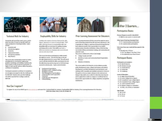 The document discusses the development and implementation of smaller massive online open courses (sMOOCs) at Colorado Community College aimed at providing flexible educational pathways and enhancing student success. It outlines the benefits of partnering with industry, the design challenges faced in creating these courses, and the specific skills targeted in three different sMOOCs. The initiative emphasizes accessibility, community-centered learning, and professional development, while adhering to a timeline and adapting to traditional educational systems.