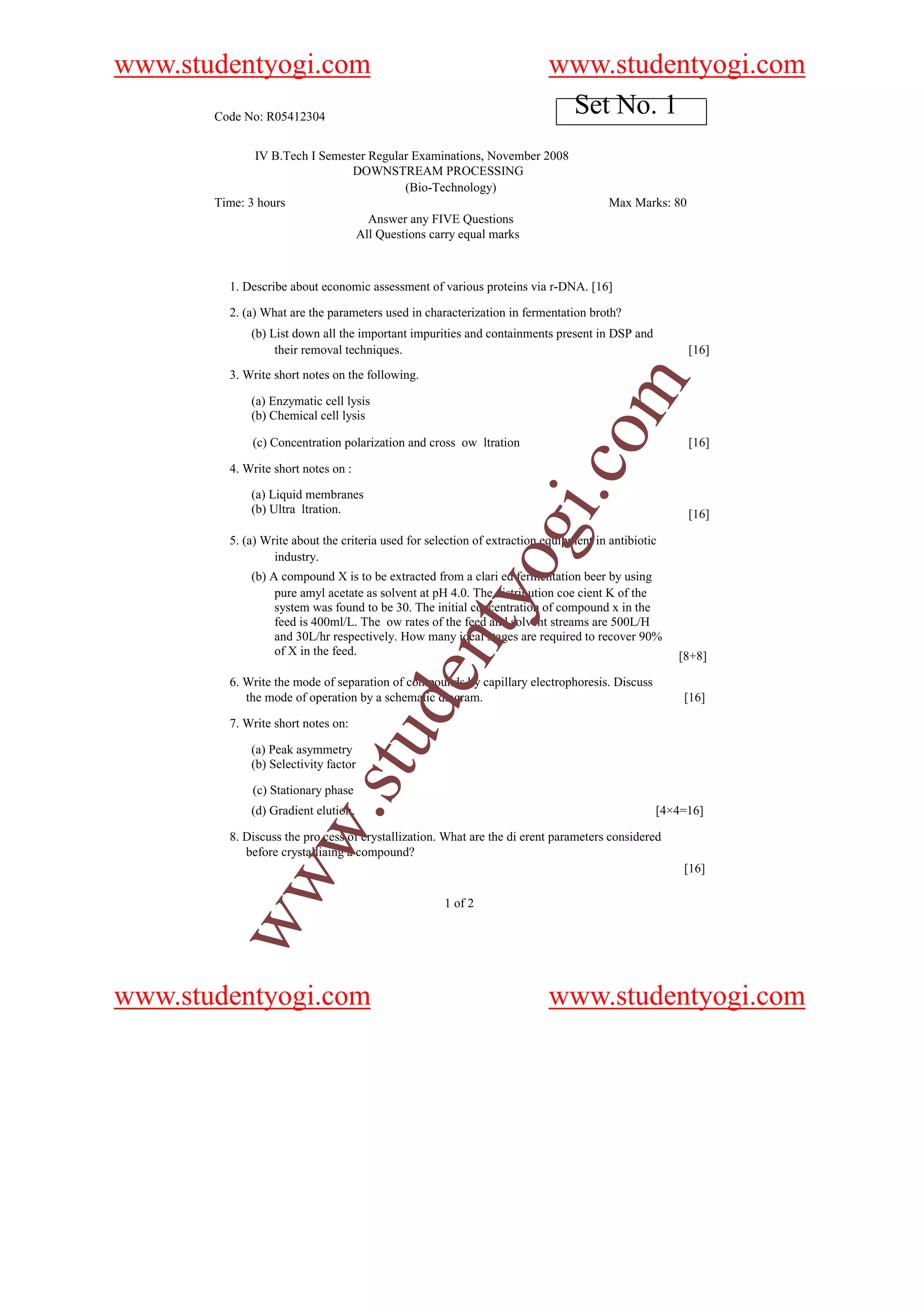 This document contains 8 questions related to the topic of downstream processing in bio-technology. The questions cover various aspects of downstream processing like economic assessment of proteins produced via recombinant DNA, parameters for fermentation broth characterization, cell lysis techniques, concentration polarization in cross flow filtration, extraction equipment selection criteria, compound extraction calculations, capillary electrophoresis separation mode, peak properties in chromatography, gel electrophoresis, and crystallization principles and process.